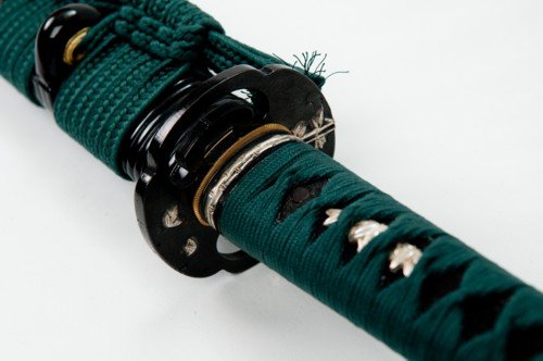 Shintogo Handmade 1095 Clay Tempered steel blade, SHARP with hamon and bo hi , 28.5 inches. Overall length including saya about 42 inches. The Ito is Green silk over Black Rayskin. Tsuka is double pinned with bamboo mekugi, silk Ito wrapped with hishigami. Weight without saya 2.10 lbs. Saya is wood with Matt Black finish and Black ratton wrap. 3 pc bullhorn, Green silk Sageo. Handmade. Brand new. Comes with wooden case , silk sword bag, stand, cleaning kit. Beautiful sword.